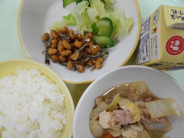 ごはん  牛乳  小魚入りフライビーンズ  きざみ和え  はくさいなべ