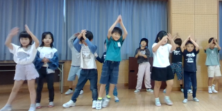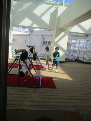 1、2枚目の写真は劇の練習の様子です。3枚目は、休み時間にテラスで身体を動かしている様子です。