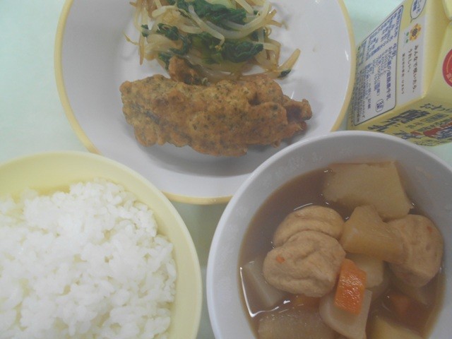 ごはん  牛乳  あじのえごま揚げ  チンゲンサイひたし  おでん