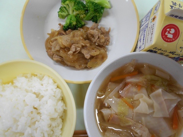 ごはん 牛乳 豚肉のおろし炒め ゆでブロッコリー ワンタンスープ