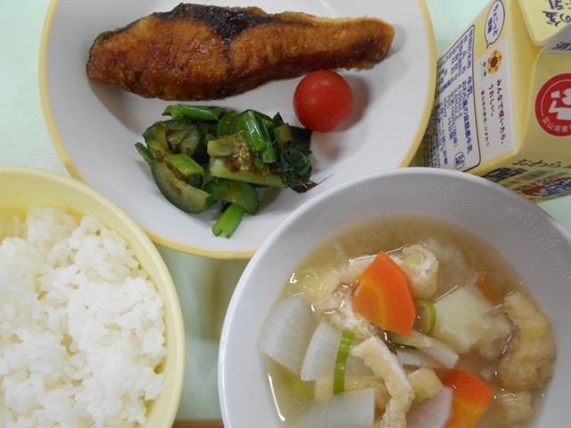 ごはん 牛乳 ふくらぎのかば焼き とろろ昆布和え ミニトマト とやまの野菜たっぷりみそ汁