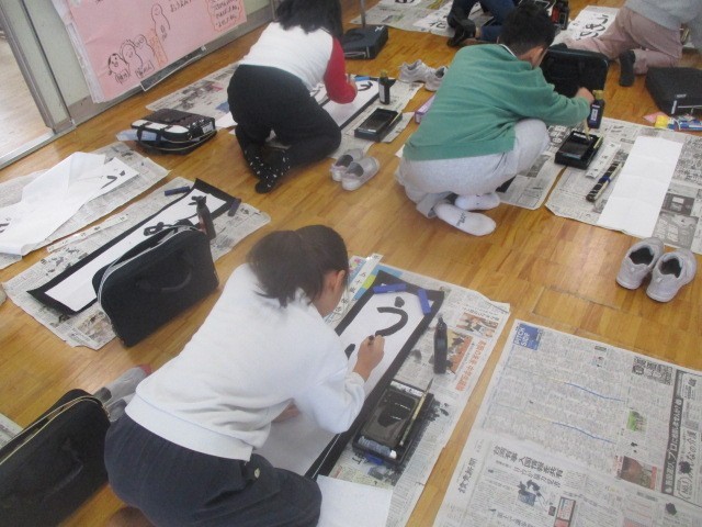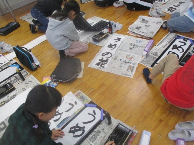 3年生は「うめの花」という言葉を書きます。全体のバランスやひらがなに悪戦苦闘しながらも練習を重ねています。