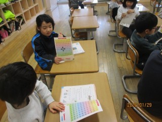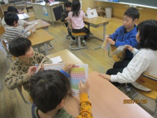 算数科の学習で100までの数を学習しました。十の位や一の位など、新しく学んだ言葉を使いながらペアで数あてクイズをしました。