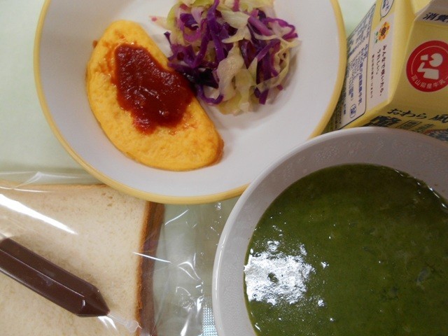 食パン 牛乳 オムレツのトマトソースかけ 紫キャベツのマリネ ほうれん草のポタージュ チョコペン