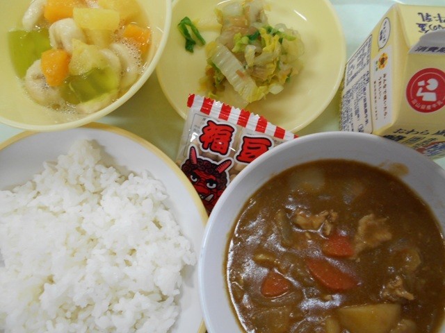 ごはん 牛乳 カレーライス 福神和え フルーツゼリーミックス 節分豆