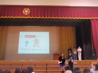 ふるさとっ子集会で、手洗いの仕方について発表をしました。クイズや、手を洗うポイントを確認しました。