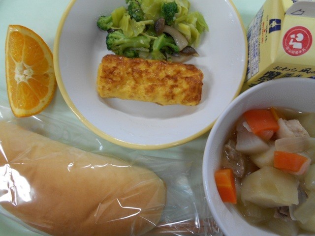コッペパン 牛乳 卵ロール ブロッコリーときのこのアヒージョ ポトフ いよかん