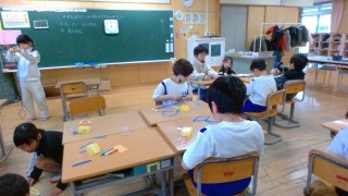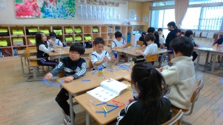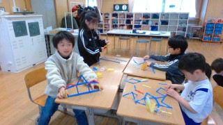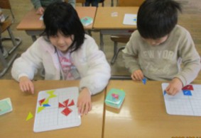 算数科の授業で、かたちづくりの学習をしています。とても楽しみながら、友達と協力したり、いろいろ考えたりして形をつくっていました。