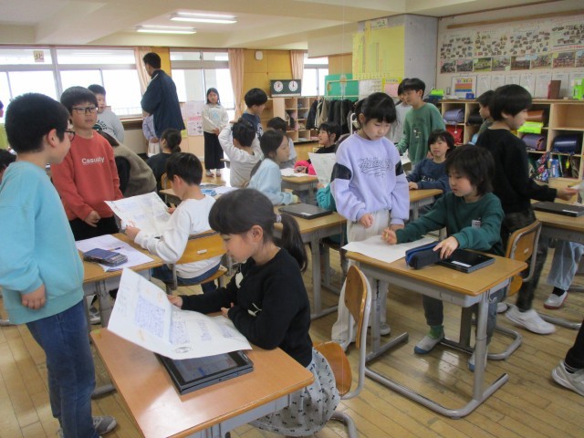 3年生が、総合的な学習の時間に調べてまとめたものを見せに来てくれました。古里地区のよいところやおすすめの場所等が書いてあり、2年生の子どもたちは興味深そうに読んでいました。