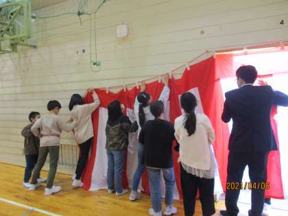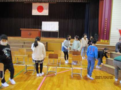 高学年の初仕事は、入学式の会場準備でした。パイプいすを並べたり、花鉢や台を運んだり、一生懸命働いていました。頼まれた仕事はもちろんですが、密にならないように間隔を考えて椅子を並べたり、自分から仕事を見付けたりするなど工夫して取り組んでいました。1年生に笑顔で入学式を迎えてほしいという思いが、子供達を動かしていました。