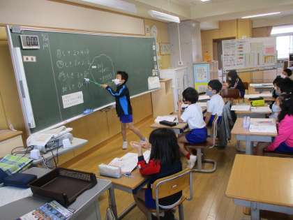 今日の算数では、かけられる数やかける数に0が含まれるかけ算の解き方を考えました。問題を見た子供たちは、「0が入っている、どうやって解けばいいのかな」と、今まで見たことのないかけ算の式に戸惑っていました。しかし、これまでのかけ算の学習を生かして、「0×4は0が4こあることだから、0を4回たせばいいんだ!」などと意見を出し合い、答えが0になることを導きました。やったね、3年1組のみんな!これからも学んだことを生かしてどんどん問題にチャレンジしていこうね。