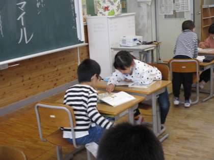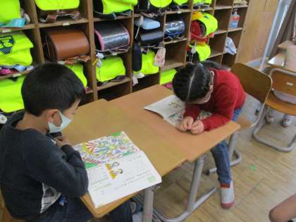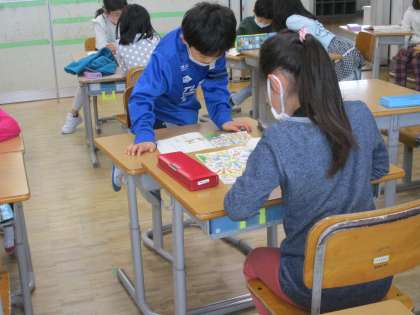 国語の授業では、人物の特徴を聞いて、絵の中から特定の人物を見付ける学習を行いました。ペアでヒントを出し合いながら、一生懸命探して欲しい人物の説明をする様子が見られました。