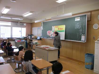 図書室オリエンテーションがありました。司書の先生から図書室の使い方や約束を教えてもらったり、昨年、1年生に人気だった本を紹介してもらったりしました。「変身トンネル」のお話をパネルシアターで聞いた後は、図書室で好きな本を選んで借りることができました。