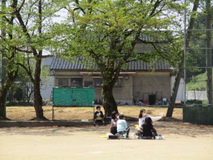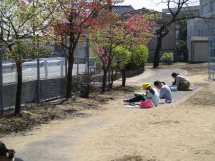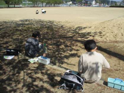 まず、紙を破いていろいろな形にします。そして、グラウンドから見えるものの中から気に入ったものをスケッチしました。鉛筆書きはなし。絵の具で直に描くことに初めは緊張気味の子供達でしたが、花、木、遊具等、自由に描いていました。同じ場所で同じ木を描いても、できあがった作品にはそれぞれの個性が光っていました。