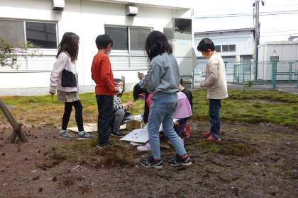学校の中庭に秘密基地を作りました。グループで何を作りたいか考えながら、協力して作りました。