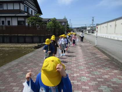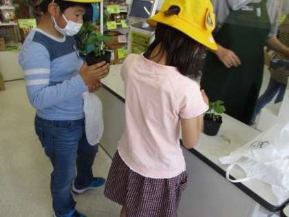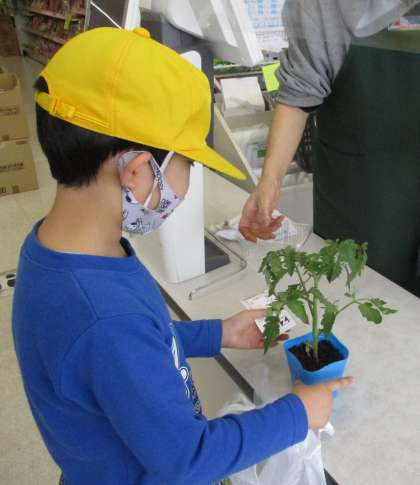 生活科の学習で、近くのお店に苗を買いにいきました。並べられた苗から、自分で苗を選んで、レジに並んで購入しました。その後、早速、学校の畑に苗を植えました。「元気にそだってほしいな」「優しく植えよう」と、選んだ苗に愛着をもって育てようと意気込む姿が見られました。