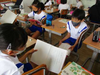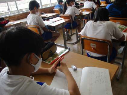 国語科の学習で音声CDを聞きながらメモを取り、聞いた内容をペアの人に説明する学習をしました。