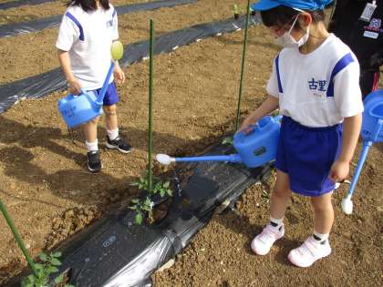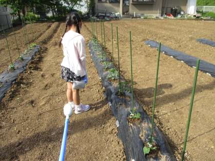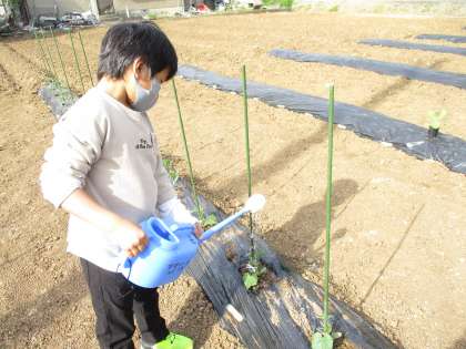 野菜の水やりを交代でしています。大きく育って欲しいという思いを込めて、丁寧に水をあげていました。