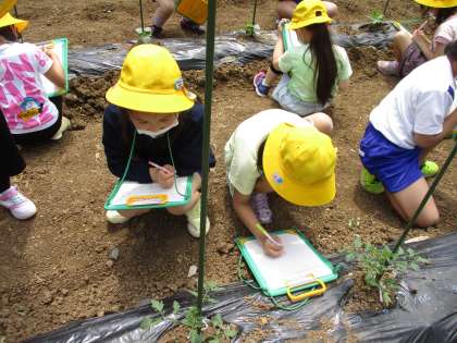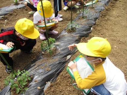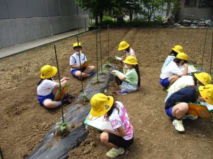 自分の植えた野菜の観察を行いました。葉の形、色、触った感じ、匂いなどを五感を使いながら観察しました。植えた日よりも少しずつ育ってきている苗をうれしそうに見る子供の姿がたくさん見られました。
