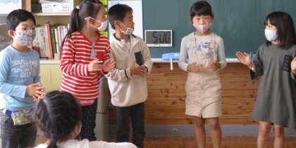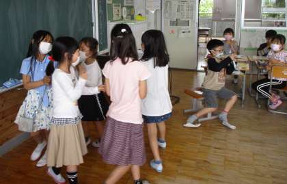 音楽では、2拍子の拍のまとまりを感じ取る学習をしました。グループごとに手を叩いたり、足を鳴らしたり、リズムに乗ってスキップしたりすることで、2拍子の取り方を工夫して「はしの上で」を表現しました。