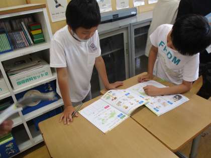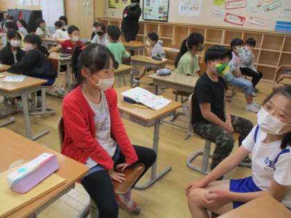 今日の外国語活動では、天気や遊びの言い方について振り返り、尋ね合い等のペア活動を行いました。