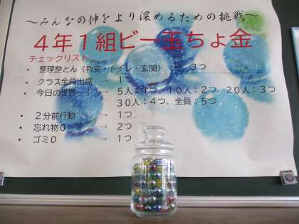 以前学年懇談会でお知らせしましたが、ビー玉貯金とは4年1組独自の取り組みです。自分たちで決めた目標を達成したらビー玉を1つ(項目によって違います。)入れていきます。達成すると、お楽しみ会等の楽しいことをしようということになっています。