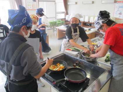 今日の1、2時間目に家庭科の学習で調理実習をしました。班ごとに手順を確認しながら作りました。