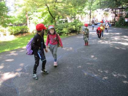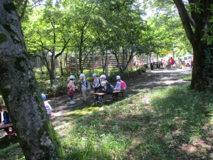2年生のあとを遅れないように、しっかりとついて歩きました。暑い日だったので、班のみんなで考えて、木陰で時々休憩し、水分補給をしながら、ファミリーパークの探検を続けました。