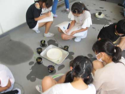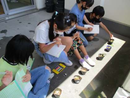 先日植えたインゲンマメが発芽して、葉が出てきました。土がなくても発芽したことに驚いていました。日光を当てないで発芽したものは「もやしみたい」と口をそろえて言っていました。