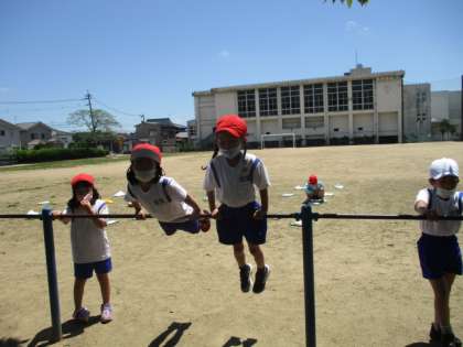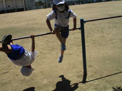 体育科で鉄棒遊びを行っています。ぶらさがり技、あがり技、ささえ技、まわり技に楽しく挑戦し、できる技を増やしていっています。逆上がりや後ろ回り、前回りができる子どももおり、教え会いながら楽しく運動しています。