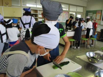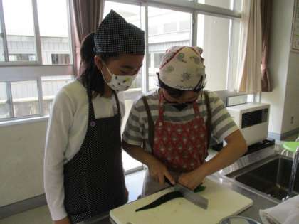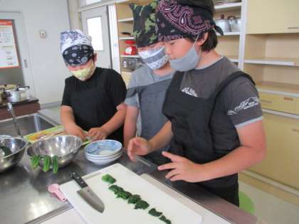 ゆでた後は、根元をそろえ、水分を切って、四センチメートルぐらいに切ります。包丁で手を切らないように慎重に取り組みました。それから皿に盛りつけました。醤油と鰹節をかけて完成です。