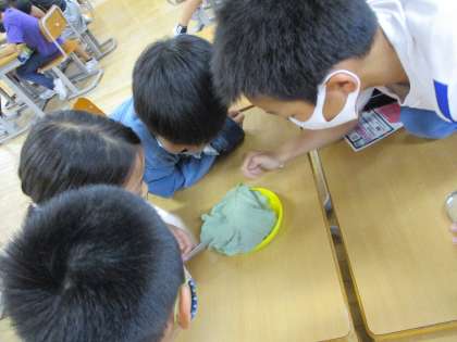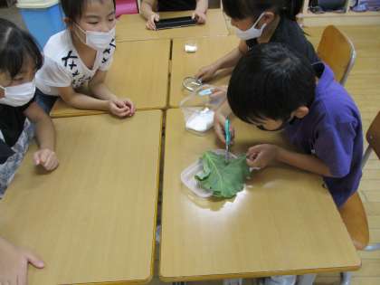 畑で育てているキャベツにモンシロチョウの卵がたくさんついています。子供たちはそれを見るなり大興奮。キャベツの葉を持ってきて、様子を見てみると、たくさんの幼虫がいました。今日の授業では、幼虫を飼育用のケースに移動させました。「5匹もいるよ!」「名前は何にしよう?」など、生き生きとした様子で活動していました。これからみんなでお世話をがんばります。