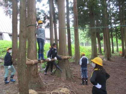 宿泊学習1日目の写真です。ポイント探し、森の遊び場作り、焚き火・スモア作りをしました。疲れたときには班で励まし合いながら活動することができました。