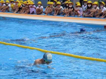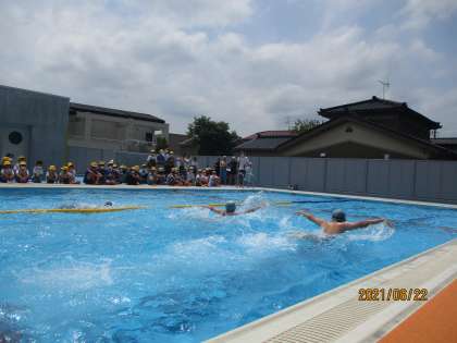 5・6年生代表が模範泳法を披露しました。クロール、平泳ぎ、背泳ぎ、バタフライの4種類です。一生懸命泳ぐ姿に見ていた人から大きな拍手をもらいました。