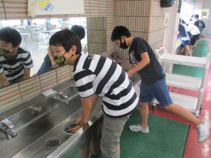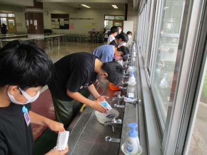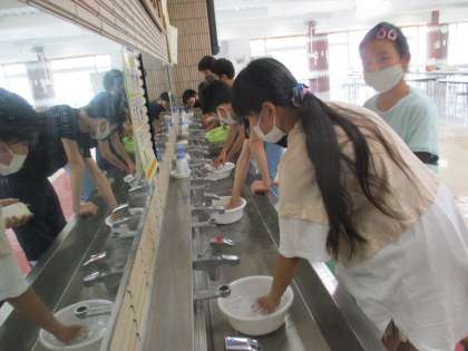 今日の家庭科では、自分の靴下を石けんで手洗いしました。汚れを見つけて、靴下をこすり合わせながら丁寧に洗うことができました。