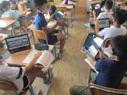 クロームブックを使って、そろばんの学習を行いました。慣れないそろばんにも、関心をもって取り組むことができていました。