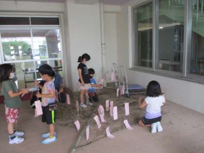 願いを込めて書いた短冊を、6年生が切ってきてくれた笹竹に結びました。玄関を通る度に願い事がかなうようにと、笹竹を見上げています。