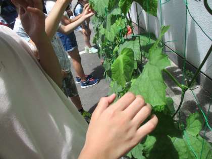 理科の学習で育てているヘチマが、ずいぶん育ってきました。手触りやにおい、触ったときの音などを確かめることができました。