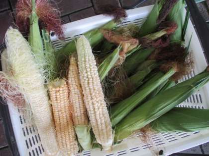 かごいっぱいのトウモロコシを収穫しました。インゲンマメは、3個。花はたくさん咲いているので、これから実を付けるのでしょうか。始業式の日にみんなで観察しましょう。