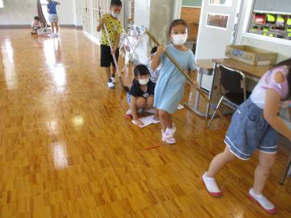 分担を相談し、ほうきやぞうきんを使って隅々まで丁寧に掃除をしていました。