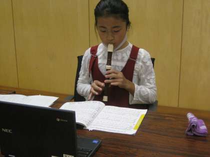 まずは、5年生さん。音楽が好きで、さらに美しい響きでリコーダーを演奏したいと研究に挑戦したそうです。演奏の練習を続けて分かったことや、美しい音色を出すこつ等を分かりやすく説明しました。そして、その成果を実際に演奏して、ふるさとっ子のみんなに聞かせてくれました。