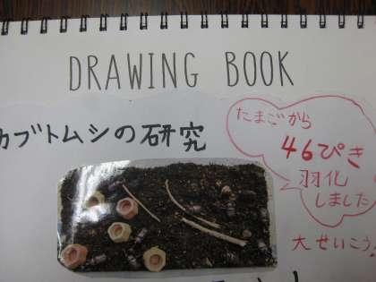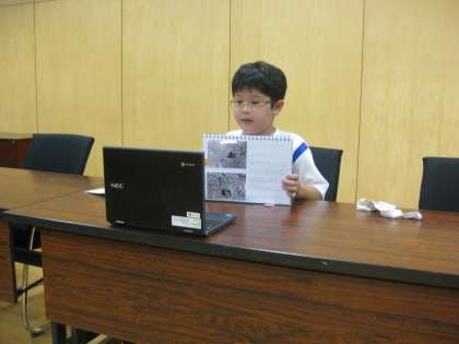 研究の動機から3年越しの研究について、細かく変態の様子が分かる写真と記録をもとにしながらファイリングし、効果的にまとめあげていました。今日の全校発表のために、短い時間に伝える発表原稿も昨日の家庭学習で考え準備して臨んでいました。
