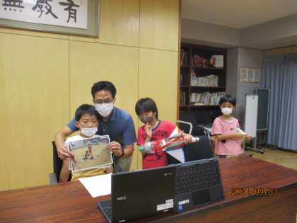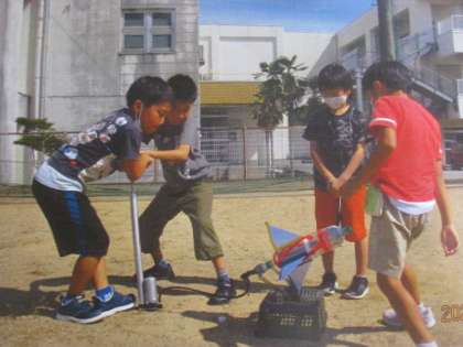 ペットボトルで作ったロケット。数日前の晴れた日に、友達とグラウンドで実際に飛ばして見せていました。今日は、その様子も交えて発表しました。