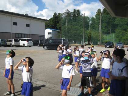 1時間目の理科。「晴れてよかった!」とグラウンドへ。でも、その瞬間、厚い雲が太陽にかかり、「あの雲から太陽出てきてくれないかな・・・?」「でも、出てきそうにないよ」「遮光プレートで早く太陽を見たい!出てこ〜い!」
