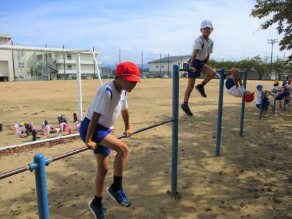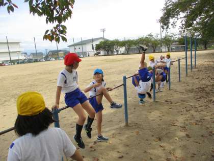 晴れた日の体育は鉄棒運動をしています。鉄棒運動の目標は「技を3つ組み合わせて取り組むこと」です。今日は、1つ目の「上がり技」を練習しました。その中の一つ、「膝掛け振り上がり」では、友達と様子を見合ったり、体を支えて補助をしてあげたりしました。そして、上手にできた友達からアドバイスを聞いて再度挑戦すると・・・「できた!」と喜ぶ子供たちが増えました。次回は、今日のおさらいと、「下り技」に取り組みます。