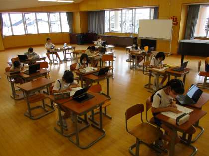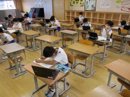 今日の算数は、Google Meetを活用して、オンライン授業の練習をしました。クロームブックの画面に映し出された課題を自分のノートに解き、考えを画面越しにクラスのみんなに伝えました。実際の授業とは違い、子供たちが課題に取り組んでいる状況を把握することや、ペアやグループになって交流し合うことはまだ難しいです。しかし、日頃からクロームブックに触れていることで、使い方や使うときのマナーが身に付いているように感じました。
