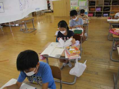 国語では、「ちいちゃんのかげおくり」を学習しています。今日は、物語の中でに出てくる言葉の中で、分からないものを調べました。注意深く本文を読みながら言葉を確認する様子が見られました。また、1学期に学習した国語辞典の使い方も生かされています。