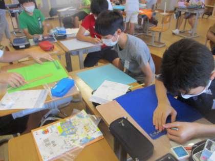 家庭科「思いを形にして」の学習では、ミシンや裁縫セットを使ってクッションやバック等を作っています。自分で活用するために作っている子供やお家の人に使ってもらうために作っている子供等、思いを込めて丁寧に作る姿が見られました。