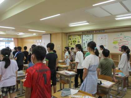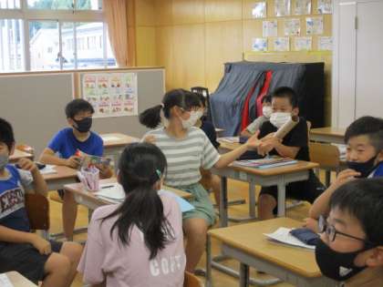 初めに、これまで学習した言い方の復習です。爆弾と称したスティックを回して、音楽が止まったときにそれを持っていた人にALTが質問します。自分に回ってくるかもしれないと思うと、はらはらどきどきでした。「今日は何曜日ですか?」「好きな教科は何ですか?」「誕生日はいつですか?」という質問にすぐに答えられないときは、誰からともなく友達からヒントが・・・温かい雰囲気になりました。