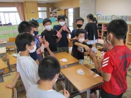 コロナ対策で、グラウンドや体育館を順番に使用するため、教室で過ごすことが多くなりました。上学年には、トランプやオセロ、将棋を置き、みんなで楽しんでいます。今日はワークスペースで「だるまさん転んだ」をしていたグループもありました。